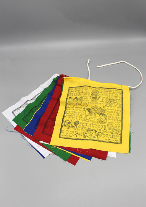 These prayer flags have windhorse figure in the middle along with mantras surrounding the deity. Various animals and lucky symbols are also printed on the flags.