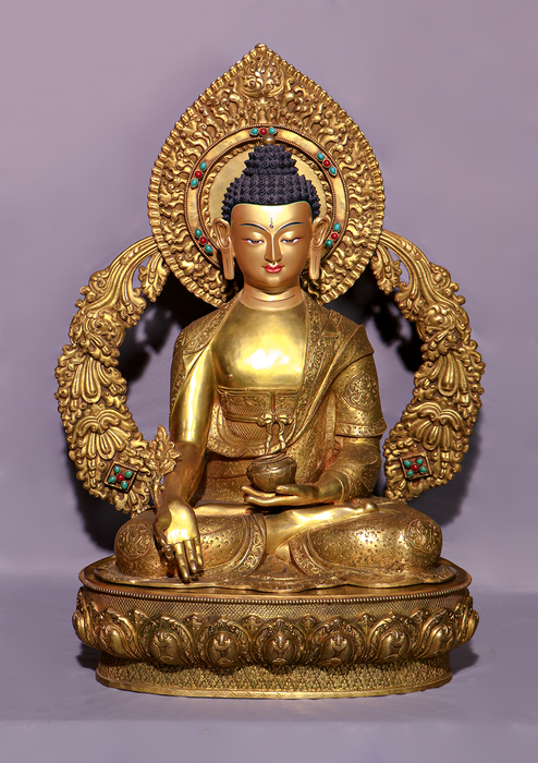 This Stone Inlaid Copper Medicine Buddha Statue is meticulously handcrafted by skilled artisans from Patan, Nepal, a city celebrated for its tradit...