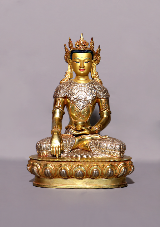 This Stone Inlaid Copper Amoghasiddhi Buddha Statue is meticulously handcrafted by artisans from Patan, Nepal, renowned for their centuries-old met...