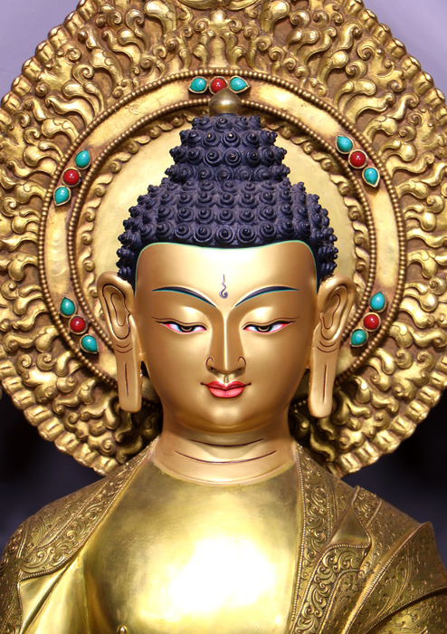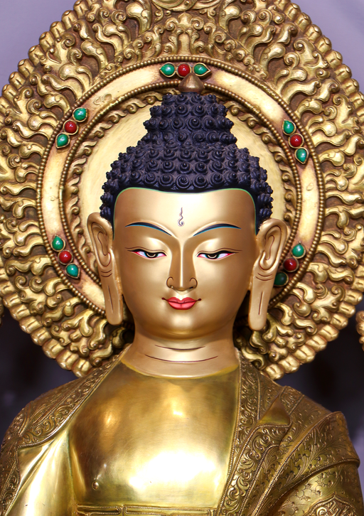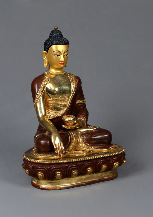 This Stone Inlaid Copper Shakyamuni Buddha Statue is a beautifully handcrafted piece created by artisans from Patan, Nepal, a historic center of Bu...