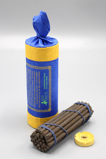 This Nagchampa incense is handmade in Nepal. This Incense formula is a traditional Tibetan medication that has been used for centuries. It is effective, non-toxic, non-addictive and made of 31 purely natural herbal ingredients prepared entirely by hand according to ancient Tibetan medical practices.