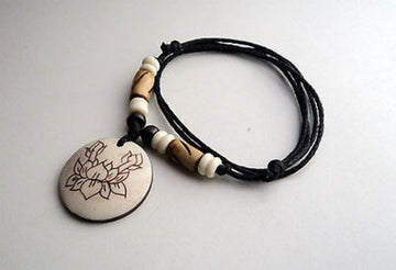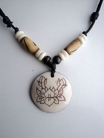 A beautiful bone necklace with a lotus flower carved pendant which has been corded to a black thread with barrel beads. The bones are collected only after the animal has been consumed for meat. No Commercial slaughtering is done for the purpose of making bone products.