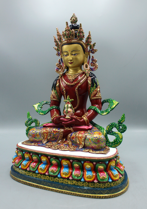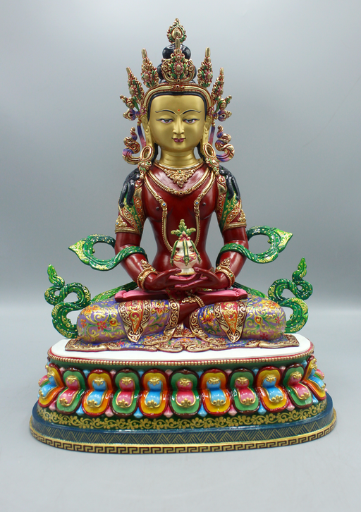 This is a captivating Hand painted Gold Plated Copper Statue of Apparmita Buddha sitting on a lotus. The statue is highly decorated with intricate ...