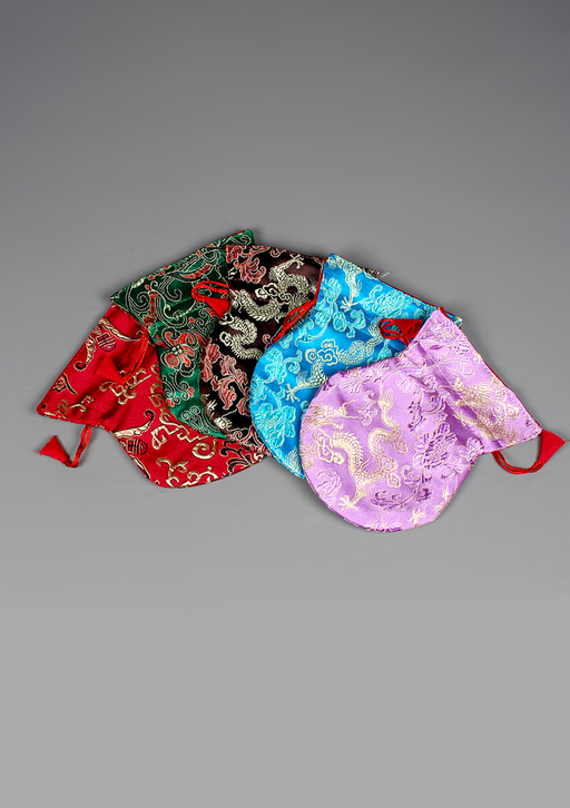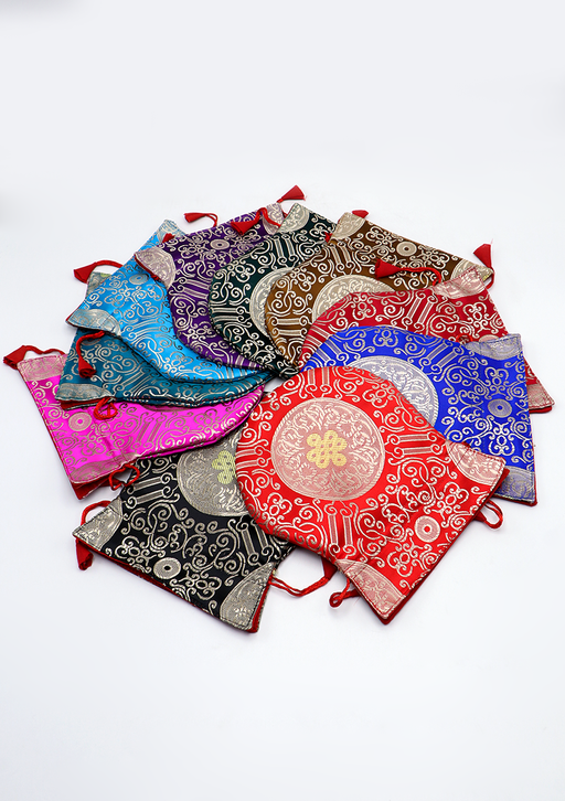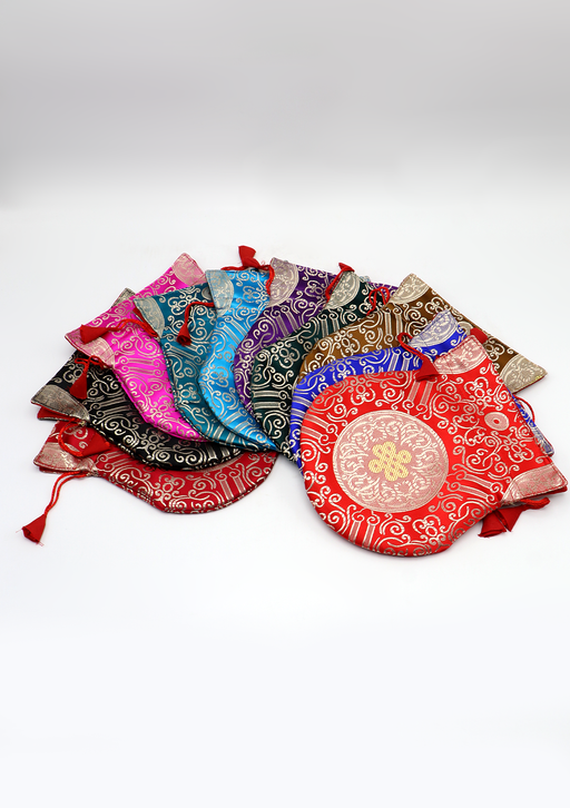 This finely handcrafted Dharma Wheel brocade drawstring mala bags are perfect for keeping your prayer mala, bracelet, coins, pen drive, or small ke...
