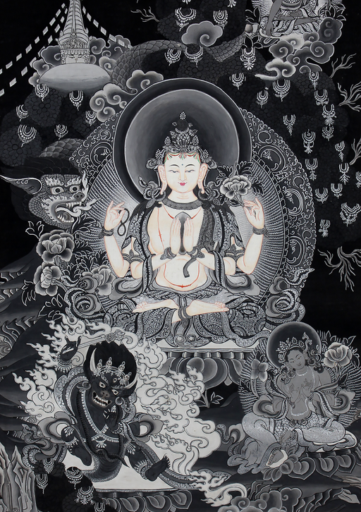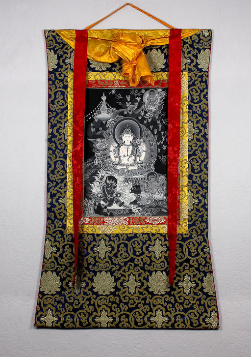 View full detailsBlack and White Chenrezig Brocade Thangka Painting