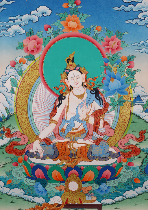 This exquisite Thangka Painting depicts White Tara, the goddess of compassion, healing, and longevity, hand-painted using mineral pigments with met...