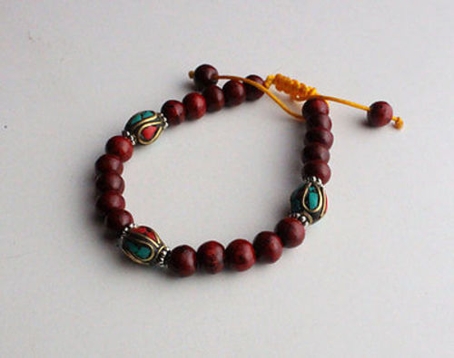 This is a beautiful Red Rose Wood Beads adjustable bracelet strung together in an adjustable nylon thread with Faux Turquoise and Coral Inlaid Spac...