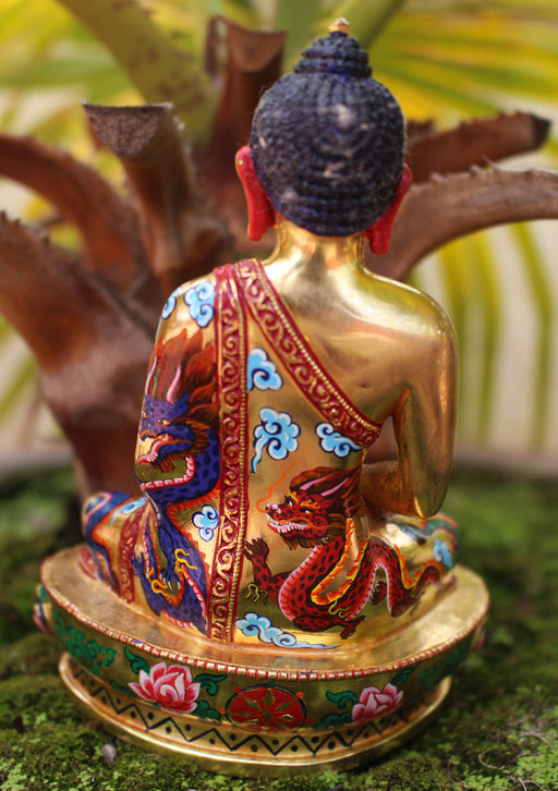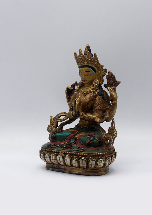 This elegant Chenrezig statue is a stunning example of traditional Himalayan craftsmanship, featuring vibrant stone inlays and meticulous detailing...