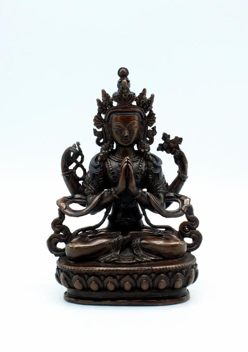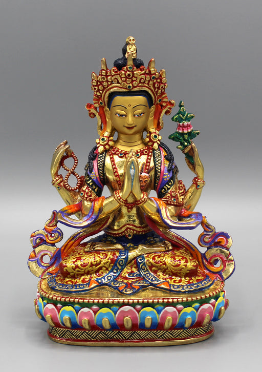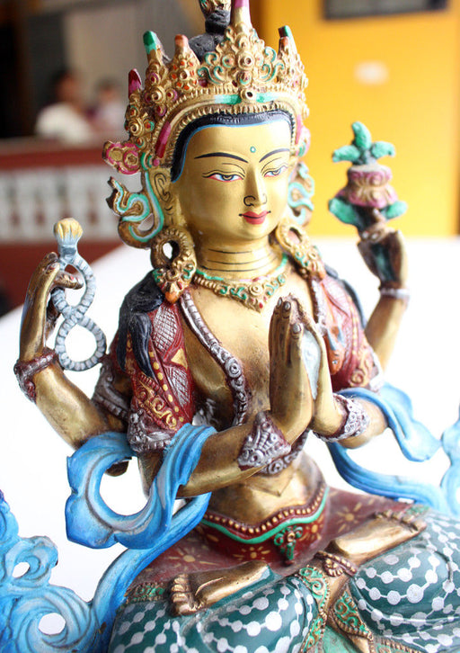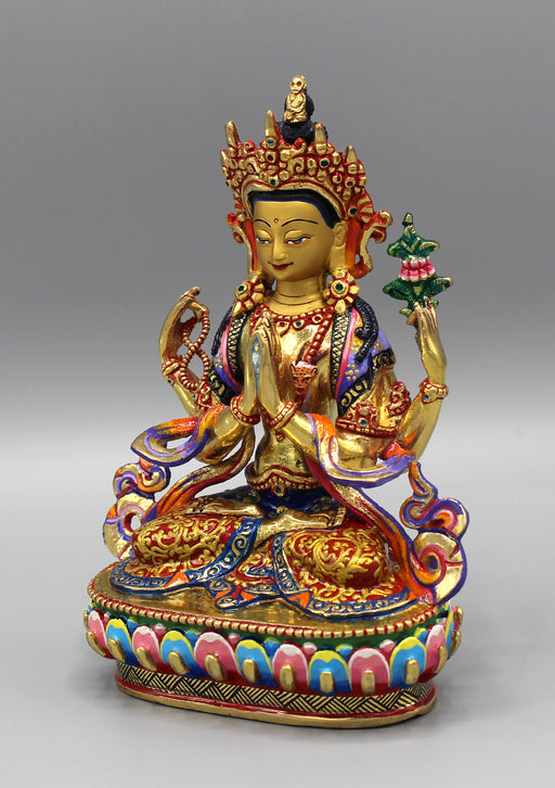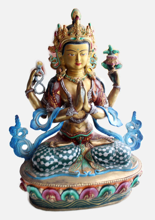This Chenrezig statue portrays the Bodhisattva of Compassion with four arms, each representing his vow to help all beings. His serene face and hand...