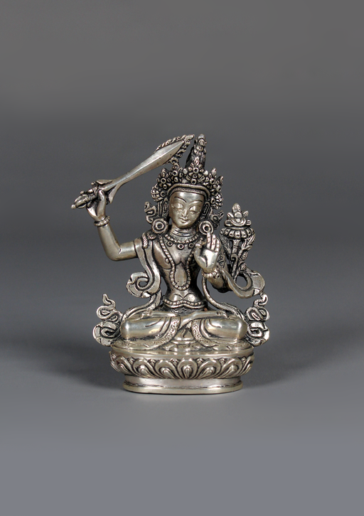 This Sterling Silver Manjushree Statue is a finely crafted masterpiece by the skilled artisans of Lalitpur, a city renowned for its sacred art trad...