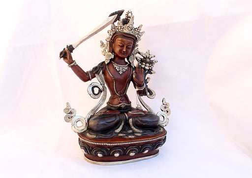 This beautifully crafted Manjushri statue depicts the embodiment of wisdom, holding a flaming sword in one hand to cut through ignorance and a lotu...