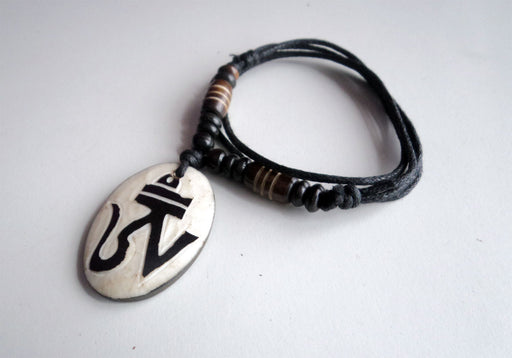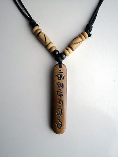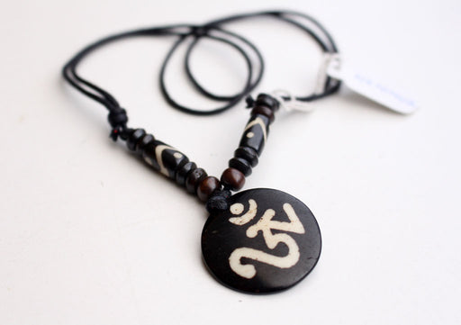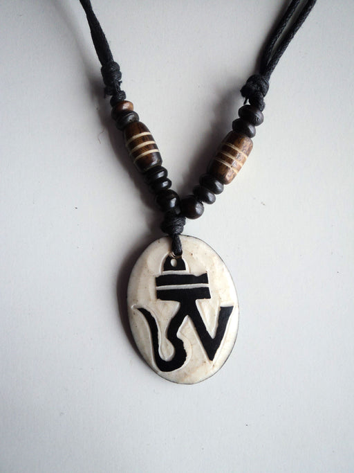 This is a necklace made with bone pendant and beads along with an adjustable cord. The pendant is hand carved with Tibetan Om and is made of buffal...