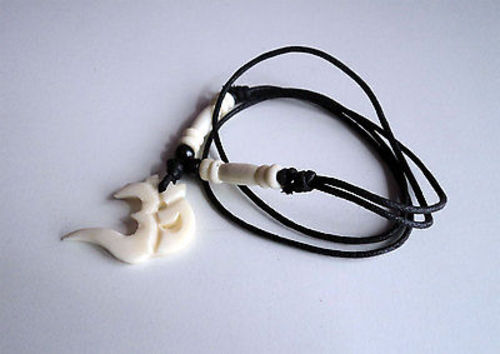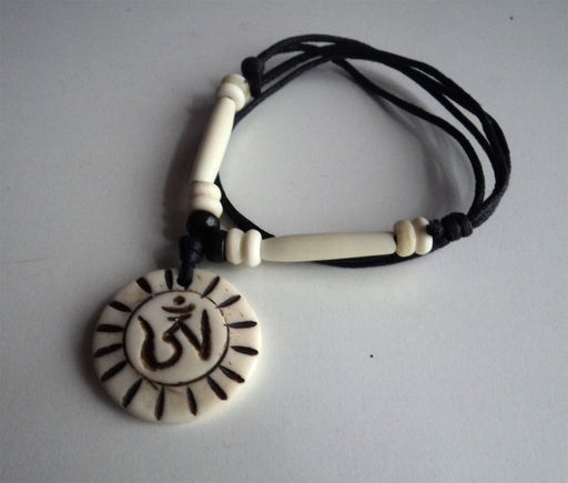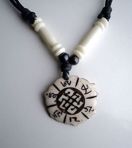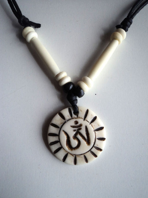 This is a bone necklace featuring a hand carved om sun power bone pendant tied to a durable thread. The buffalo bone is intricately carved to form ...