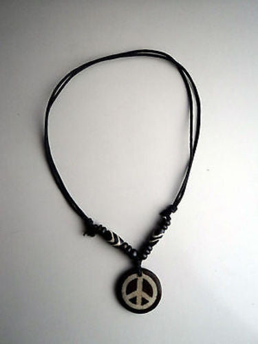 A beautiful bone necklace with a peace pendant which has been corded to a black thread with barrel beads. The bones are collected only after the an...
