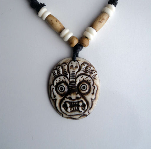 This is a beautiful necklace with a bone pendant of Hindu deity Bhairab. The buffalo bone is intricately carved to form the deity's image and is se...