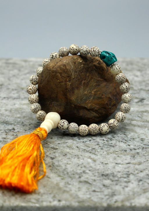 These are off white lotus seeds wrist mala strung together in stretchable cord. The wrist mala features a yellow tassel along with guru bead and fa...