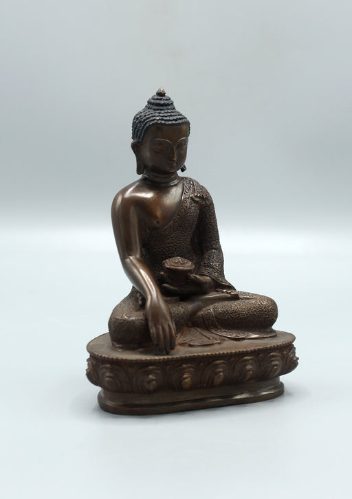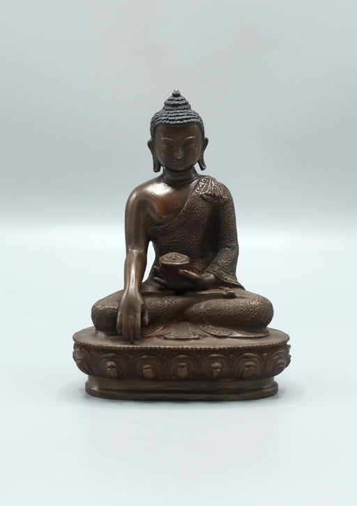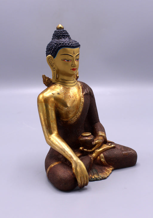 This is a handmade Copper oxidized Medicine Buddha statue from Nepal. The Copper Medicine Buddha is seated on a lotus as platform, holds a vase in ...