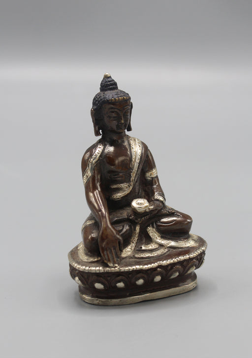 This is a 3.3 inch high copper statue of Shakyamuni Buddha with silver robe. Shakyamuni Buddha Statue is seated in Dhyana Asana or Meditative Pose...