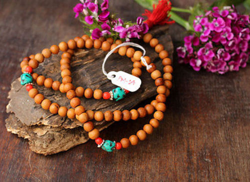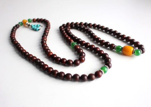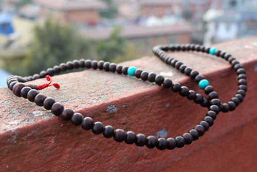 This rosewood prayer mala is made of round rosewood beads and has three turquoises spacers in between. Usually beads of Rosewood are strung togethe...