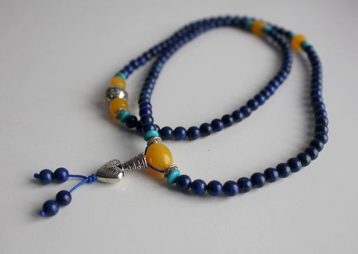This is a beautiful Faux Lapis Lazuli Prayer Beads adjustable Mala consisting of 108 beads along with 3 amber spacers and a heart charm. The beads ...
