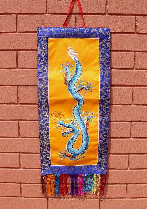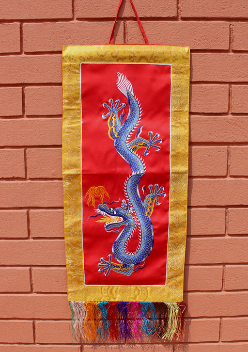 This is a dragon banner. The dragon is heavily embroidered on a polyester fabric which is then framed on a beautiful brocade. The banner has 4 inch...
