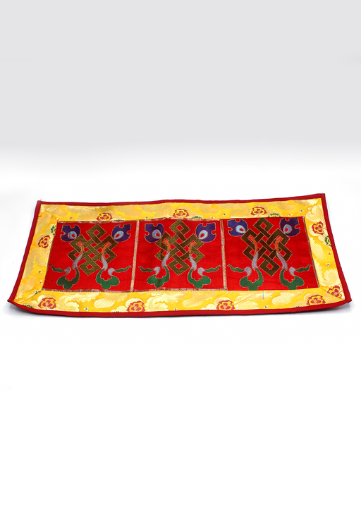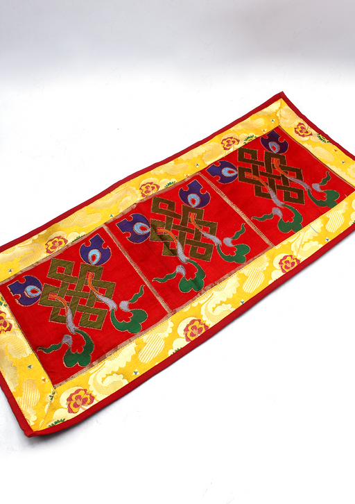 This is a beautiful Eternal knot Yellow altar cloth with red brocade. This altar cloth has three eternal knots embroidered into it. The eternal kno...