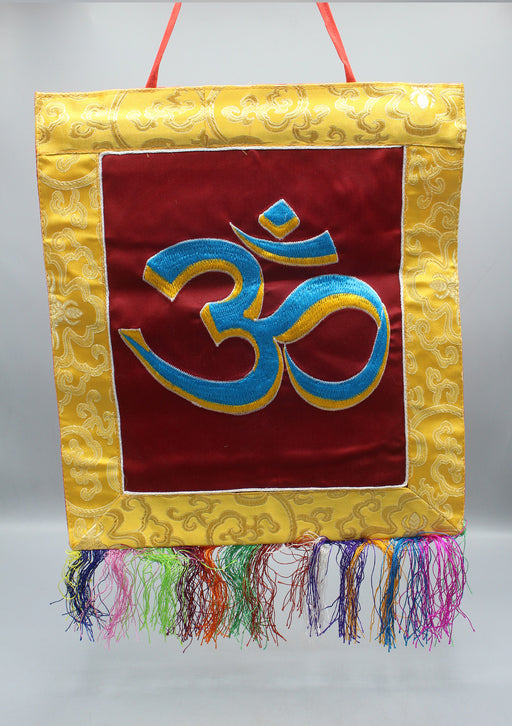 This is a brocade framed polyester Wall hanging banner from Nepal. This banner is embroidered with the OM symbol. The wall hanging has colorful tas...
