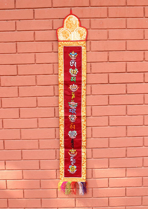 This is a beautifully embroidered Astamangal banner with Om Mani Scriptures. The Maroon polyester fabric is heavily embroidered with Tibetan lucky ...