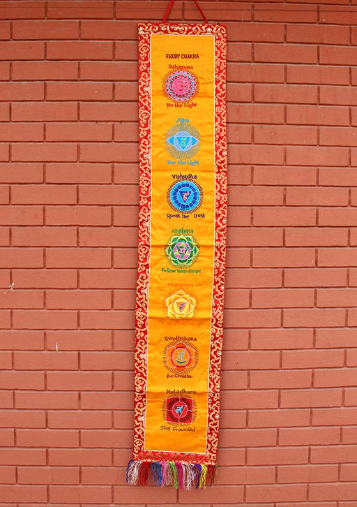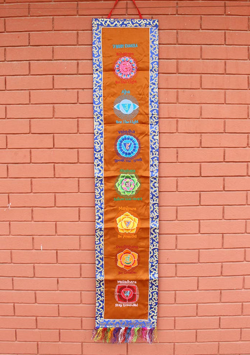 This is a brocade framed polyester Wall hanging banner from Nepal. This banner is embroidered with the seven chakra symbol. The wall hanging has co...