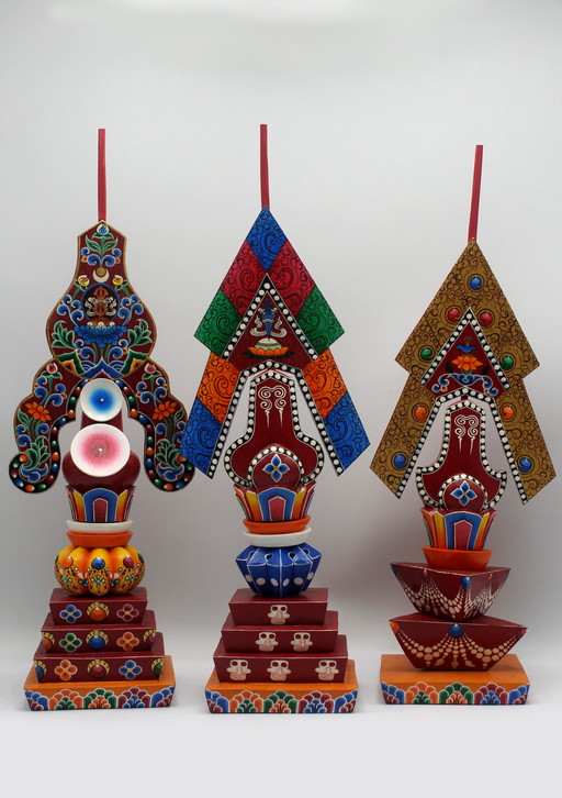 This hand-painted torma set features intricate craftsmanship and vibrant colors, embodying traditional Tibetan artistry. The set includes three dis...