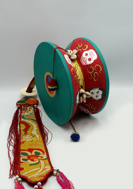 This is an exclusive wooden framed hand painted Chod drum damaru handmade with care in Nepal. Damaru is a two-headed drum. It has significance in b...