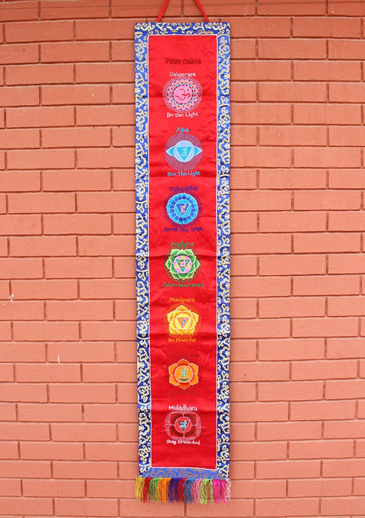 This is a brocade framed polyester Wall hanging banner from Nepal. This banner is embroidered with the seven chakra symbol. The wall hanging has co...