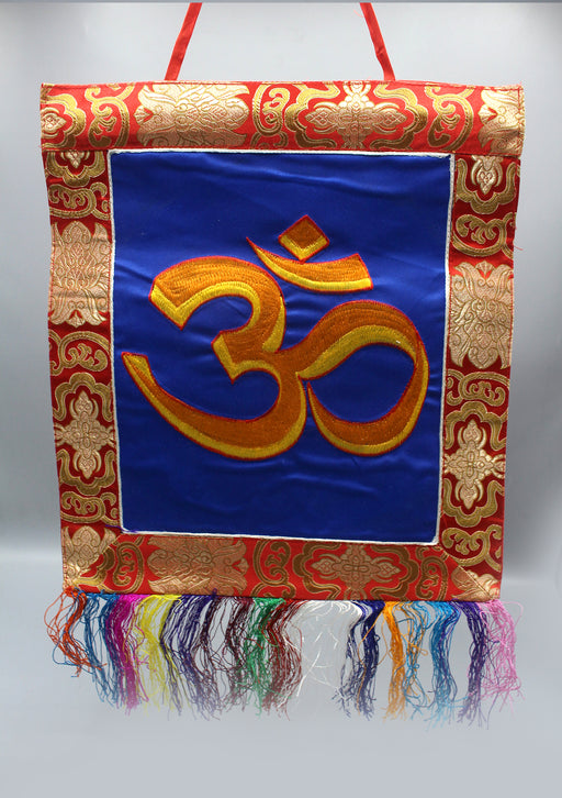 This is a brocade framed polyester Wall hanging banner from Nepal. This banner is embroidered with the OM symbol. The wall hanging has colorful tas...