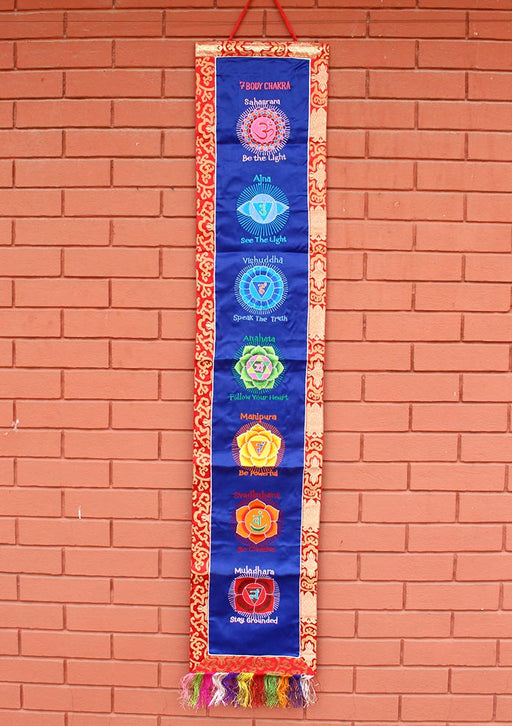 This is a brocade framed polyester Wall hanging banner from Nepal. This banner is embroidered with the seven chakra symbol. The wall hanging has co...