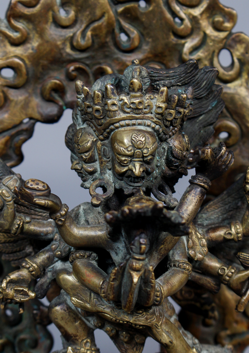 This Antique Copper Simhamukha Statue is expertly handcrafted by master artisans from Patan, Nepal, a city celebrated for its ancient metalcraft tr...