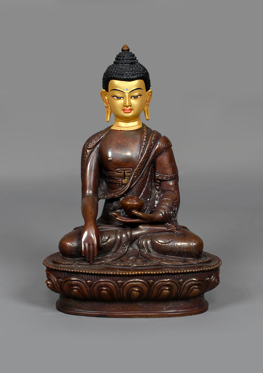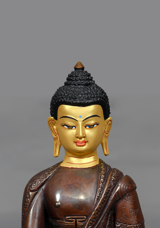 This Partly Gold Plated Shakyamuni Buddha Statue is masterfully handcrafted in Patan, Nepal, a city celebrated for its metal artistry passed down t...