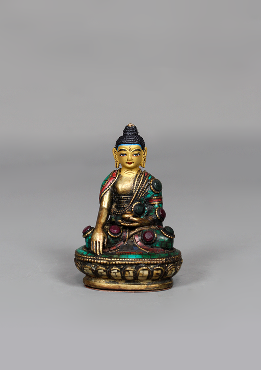 This Stone Inlaid Copper Shakyamuni Buddha Statue is a beautifully handcrafted piece created by artisans from Patan, Nepal, a historic center of Bu...