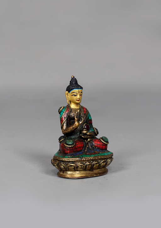 View full detailsStone Inlaid Copper Amoghasiddhi Buddha Statue 3.25" H