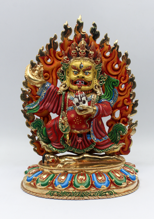 This exquisite hand-painted Mahakala statue captures the fierce yet compassionate protector of wisdom in vivid detail. Adorned with fiery flames sy...