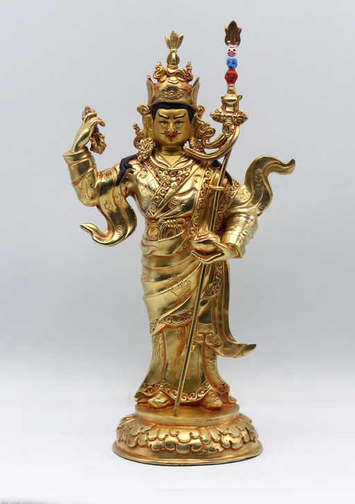 This magnificent standing gold-plated Guru Padmasambhava statue is a masterpiece of Buddhist artistry. Guru Rinpoche, known as the "Precious Maste...