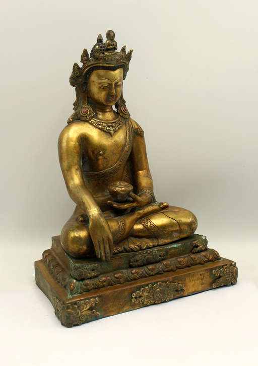 This is a fully gold plated hand-painted copper statue of Meditating Medicine Buddha sitting on a Double Lotus. The Medicine Buddha is seated on a...