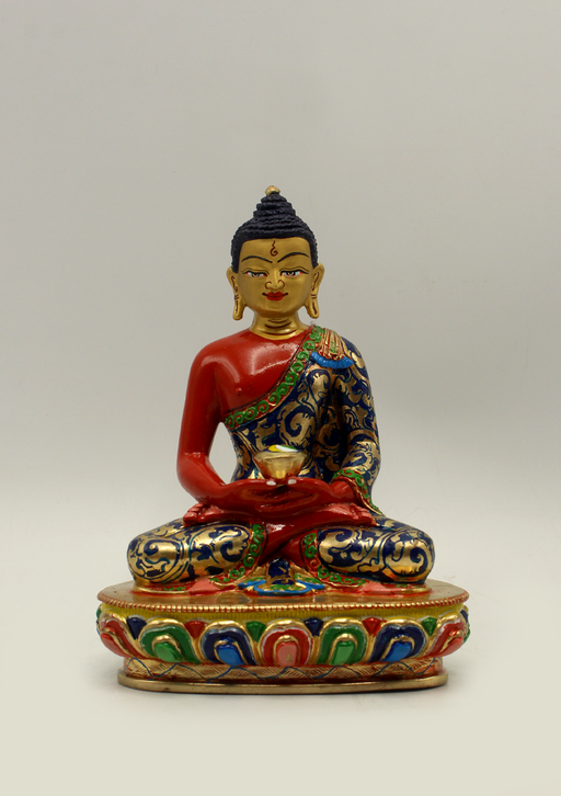 This 8-inch tall statue of Shakyamuni Buddha features partial gold plating and intricate paintings of Lotus and floral motifs adorning the Buddha's...