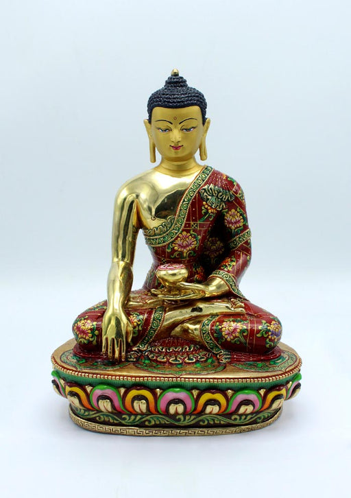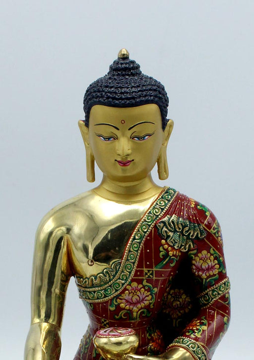 This is a 11" inch high gold plated copper statue of Shakyamuni Buddha. The robe of Shakyamuni has painted In Red with Golden color flowers pattern...