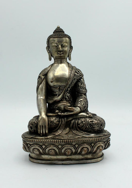 This is a White Metal Shakyamuni Buddha statue handmade in Nepal. The statue has fine floral carvings done on the body of the statue by our master ...