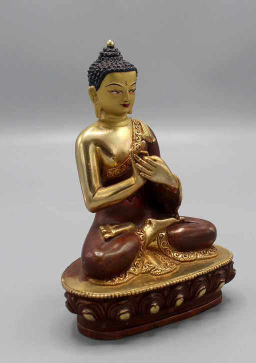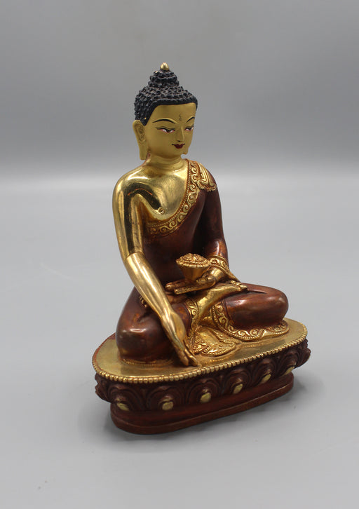 This is a statue of Shakyamuni Buddha which has been Partly gold plated. Shakyamuni Buddha Statue is seated in Dhyana Asana or Meditative Pose, al...