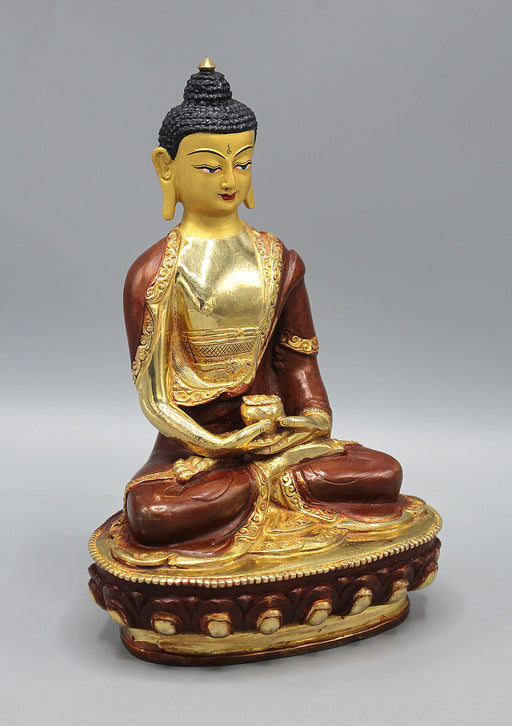 This is a copper statue of Shakyamuni Buddha. The statue is fully gold plated. The statue has been hand carved with detailed floral motifs. The met...