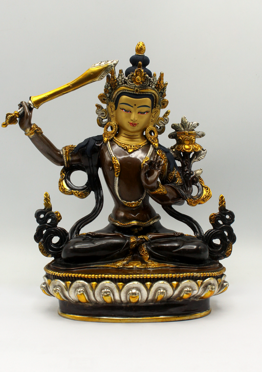 Manjushri is depicted as a male Bodhisattva wielding a flaming sword in his right hand, representing the realization of transcendent wisdom which c...