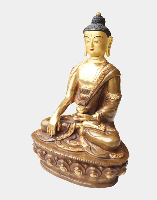 This is a gold plated copper Healing Buddha statue on a lotus. This statue has been made by a third generation sculpture in Patan, Nepal. The Heal...