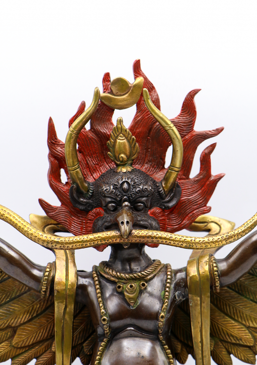 This is a copper oxidized statue of Garuda, the powerful mythical bird and divine protector in Buddhist and Hindu traditions. The statue features G...