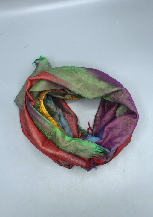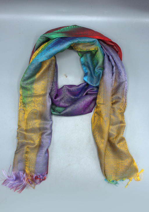 This is a silk mixed polyester multi color shawl handmade in Nepal. The shawl is smooth to the touch and very light weight to carry with. These sh...